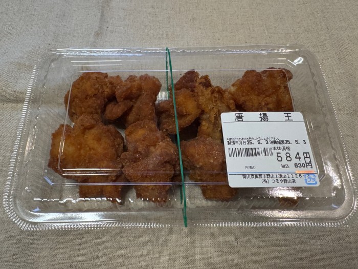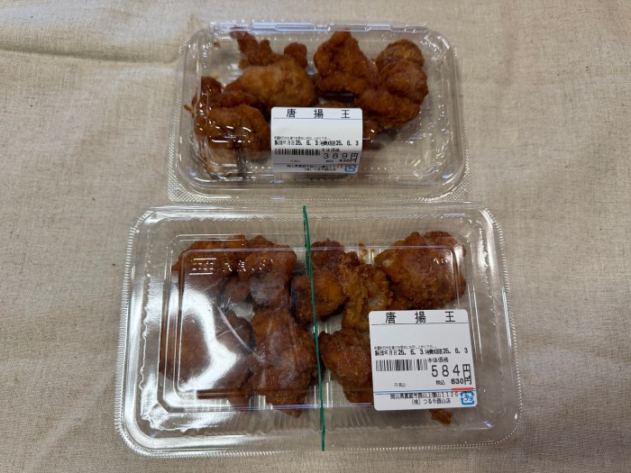 自らを唐揚げの王と名乗る『つるや』の唐揚王は、6個入り税込630円、4個入り税込420円。大きいのを買ったら割安とかは無いらしい。