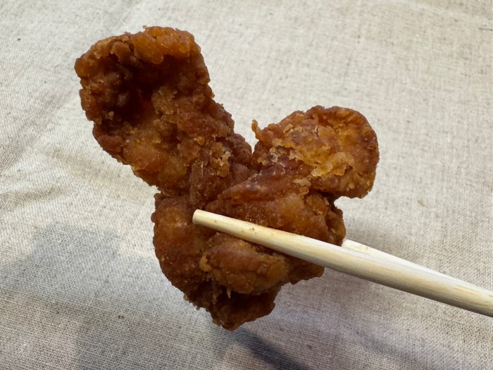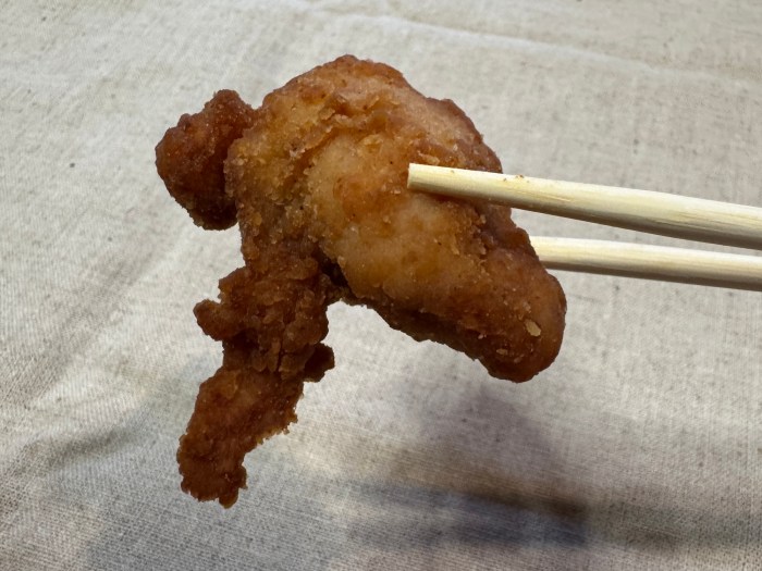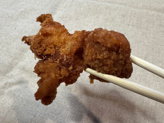 で肝心の味はというと、見た目のとおり“テイクアウトに全振りした唐揚げ”である。唐揚げには様々なタイプがあるが、中でも「ジューシーなやつ」「フワフワしたやつ」などは長時間の持ち運びに適さない。なぜならベチャベチャのギトギトになるから。