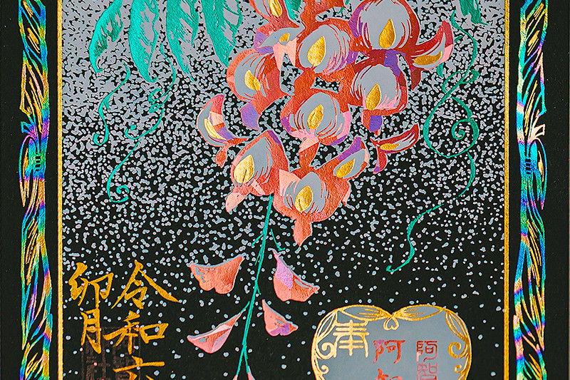 なんと美しい、きらめく御朱印!「阿智神社」で藤の時期に頒布される特別御朱印「阿知の藤」です。毎年デザインは同じですが、台紙や箔の色を変えて頒布されています。季節限定なので、藤の時期以外は頒布がない点にご注意ください。また、時期によっては藤以外の切り絵御朱印や、「雨天の日だけ」といったレアな御朱印が頒布されることもあるそうですよ。