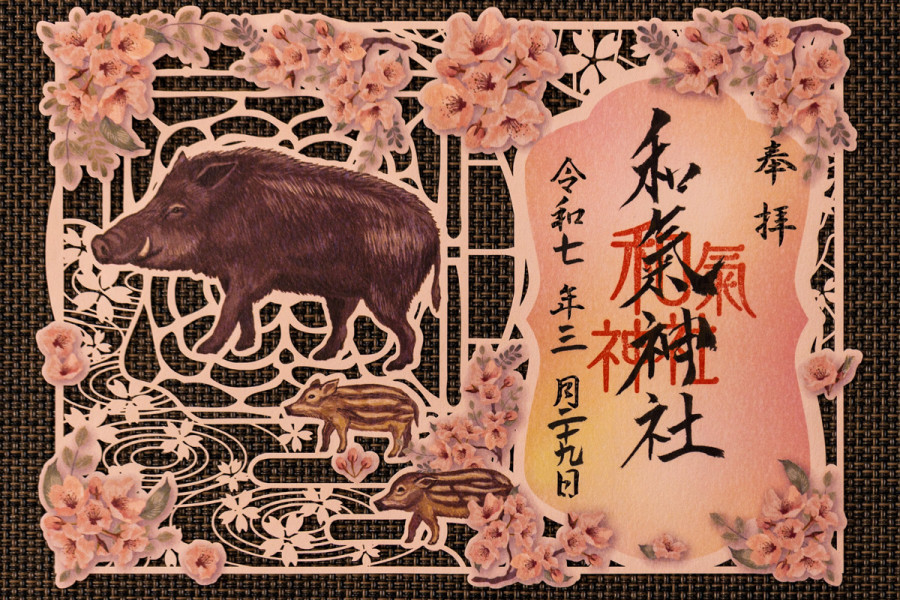 桜の季節にいただいた「和気神社」の季節限定御朱印。繊細に切り抜かれた桜の模様の中に、神社とゆかりの深いイノシシ親子の姿が描かれています。季節ごとに趣向を凝らした限定御朱印のほか、通常の御朱印や「月替り御朱印」もあり、訪れるたびに違った楽しみがあります。