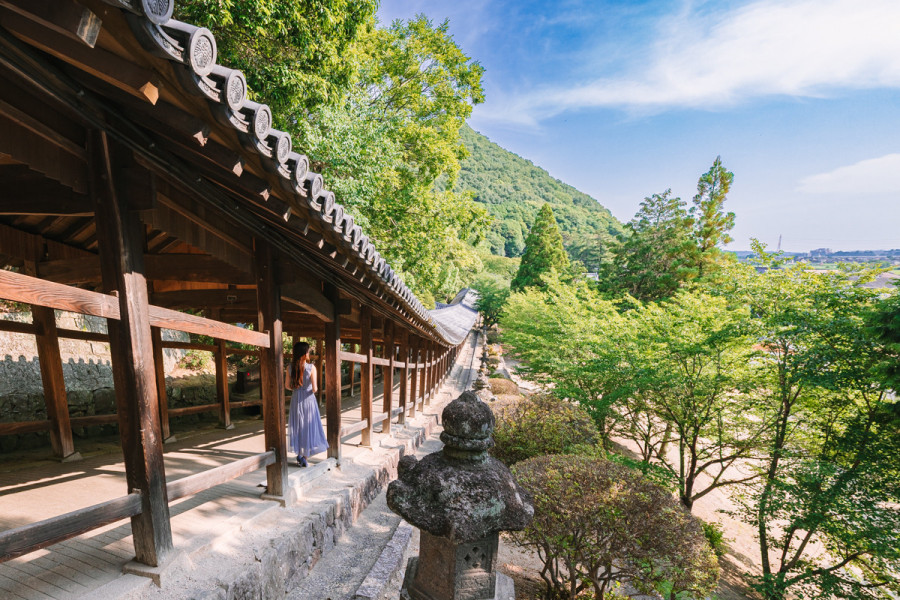 アジサイ御朱印にも描かれていた、吉備津神社の廻廊です。全長約360メートル、ゆるやかな坂に沿って続く整然とした美しさは壮観で、実際に歩いてみると感動します。なお、本殿は国宝にも指定されており、その壮麗な佇まいも見逃せません。