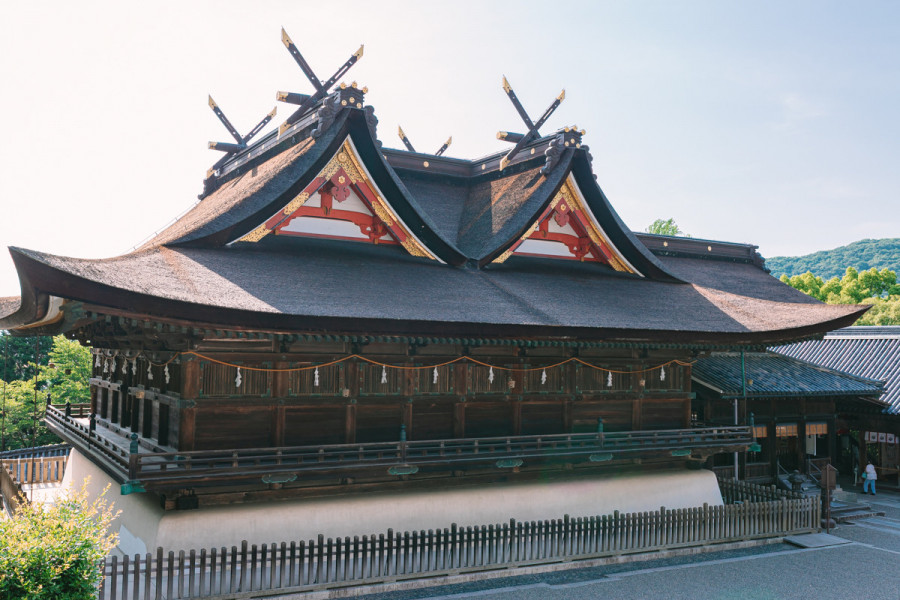 和氣神社では、なんと狛犬ならぬ「狛いのしし」が境内を守っています。イノシシの面をつけた舞がお祭りで奉納されることもあり、隣接する和気公園の藤棚とともに、アニメ「鬼滅の刃」の登場人物・嘴平伊之助の「聖地」として知られています。さらに、「関西一の棟梁」が手がけたといわれる本殿も見どころのひとつ。建築や木彫の美しさにもご注目ください。