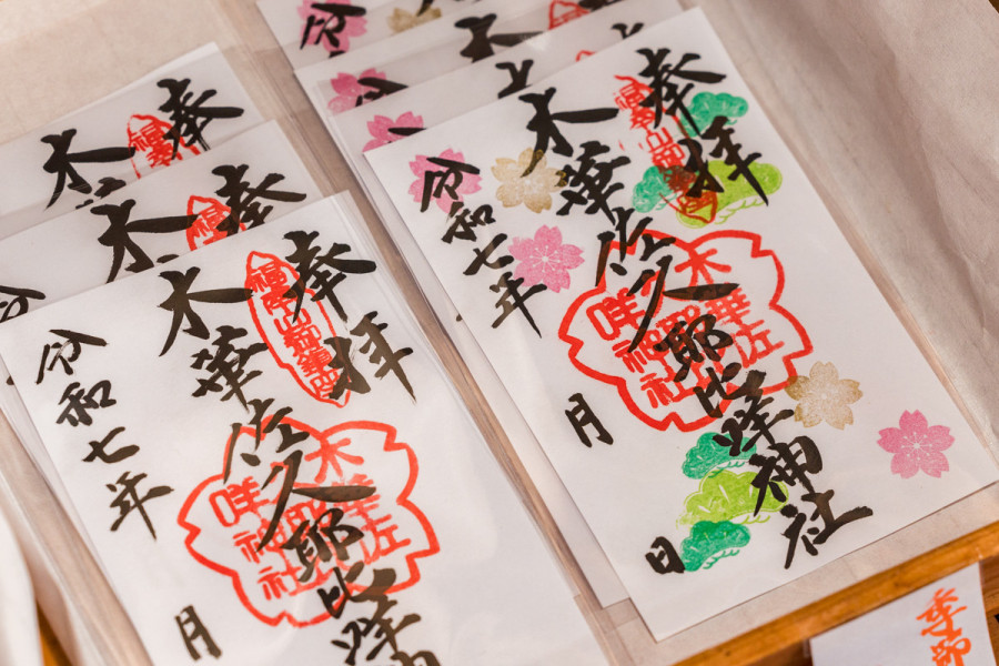 「木華佐久耶比咩神社」の御朱印は、桜や松のスタンプが押されていて、思わず頬がほころぶかわいらしさ。美しい神社の名前とのコントラストも印象的です。季節ごとにモチーフが変わるので、何度訪れても新しい出会いがあります。初穂料は賽銭箱にお納めください。