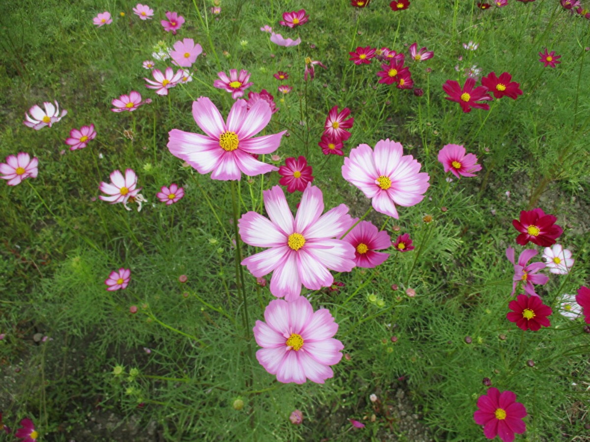 花びらの形や色が違う数種類のコスモスが植えられており、秋風にゆれるそのグラデーションはため息のでる美しさ。