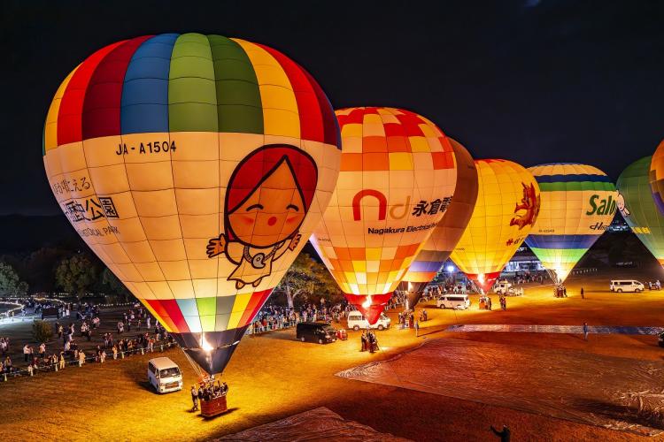 熱気球の夜間係留「ナイトグロー」も見どころのひとつ。バーナーの炎でバルーン全体が巨大なちょうちんのように闇夜に浮かび上がる姿は、迫力満点。子どもたちも思わず歓声を上げるような、ドラマチックな光景が広がります。