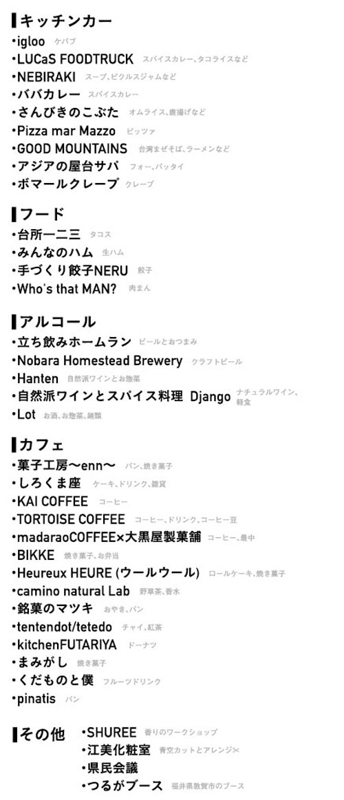 キッチンカーやフード・カフェ・アルコールなどの飲食店をはじめ、クラフト・アンティーク、花・植物など、長野県初出店を含む67店が集結。アルコールも楽しめる大人の蚤の市のようなスタイルで行われます。