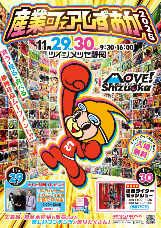 毎年恒例、ツインメッセ静岡に静岡市をはじめ近隣地域の美味しい産品や自慢の逸品が大集合します。新鮮な農産品や鮮魚、伝統工芸品、木の温もりに触れる体験コーナーなど、グルメと楽しい企画が満載。話題のお笑い芸人や仮面ライダーショーなど、ステージイベントも行われます。