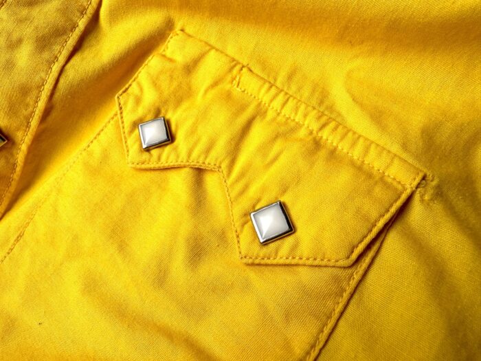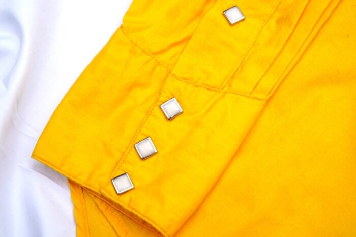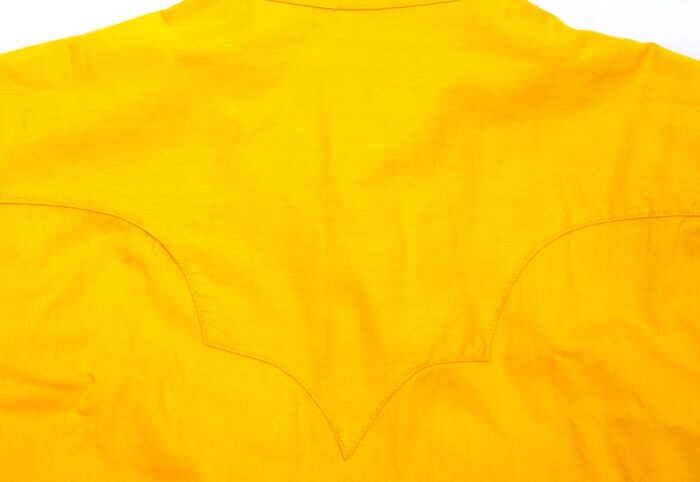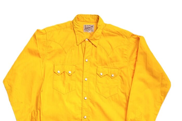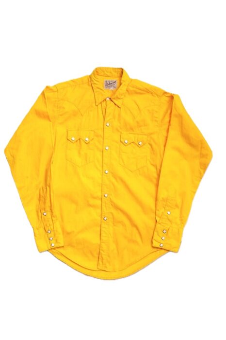 タグのデザインから1960年代ごろと判別できるロックマウントの定番ウエスタンシャツ。イエローカラーが際立つ平織り生地を使っており、薄手ながらもタフな仕上がり。胸のノコギリ型のフラップや装飾性のあるバックスタイルのウエスタンヨークなど、カウボーイシャツの醍醐味が詰まったグッドデザインとなっている。