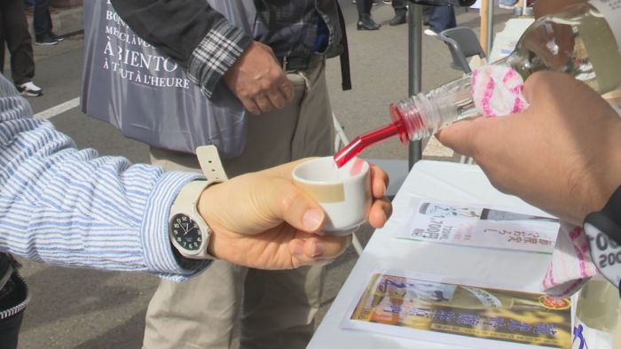 初日は開始の午前11時から多くの人が訪れ、おちょこを片手に試飲を楽しんでいました。