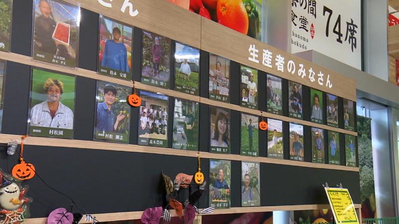 入ってすぐ左手の壁には、生産者の写真と名前が貼られています。作り手の顔が見える野菜・果物です。