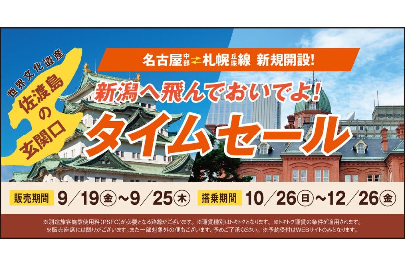 対象路線と片道運賃は、新潟―札幌(丘珠)が7,700円~、新潟―神戸が7,700円~、新潟―名古屋(中部)が7,000円~、名古屋(中部)―札幌(丘珠)が8,000円~。このタイムセールはWebサイトからの購入に限られる。運賃種別は「トキトク運賃の条件を適用する」としている。
