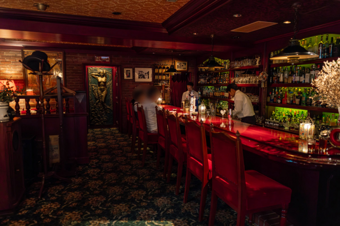 お店は“大人の隠れ家”を体現したようなオーセンティックバーで、艶のある深紅のカウンターテーブルが目を引きます。