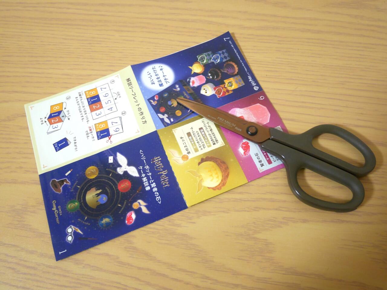 説明書き通りに折り目を付けていき、ハサミで1ヶ所切るだけで、ケーキの味や物語に登場するアイテムのポイントを紹介した「<ハリー・ポッターと賢者の石>ケーキ解説書」リーフレットが完成します♪