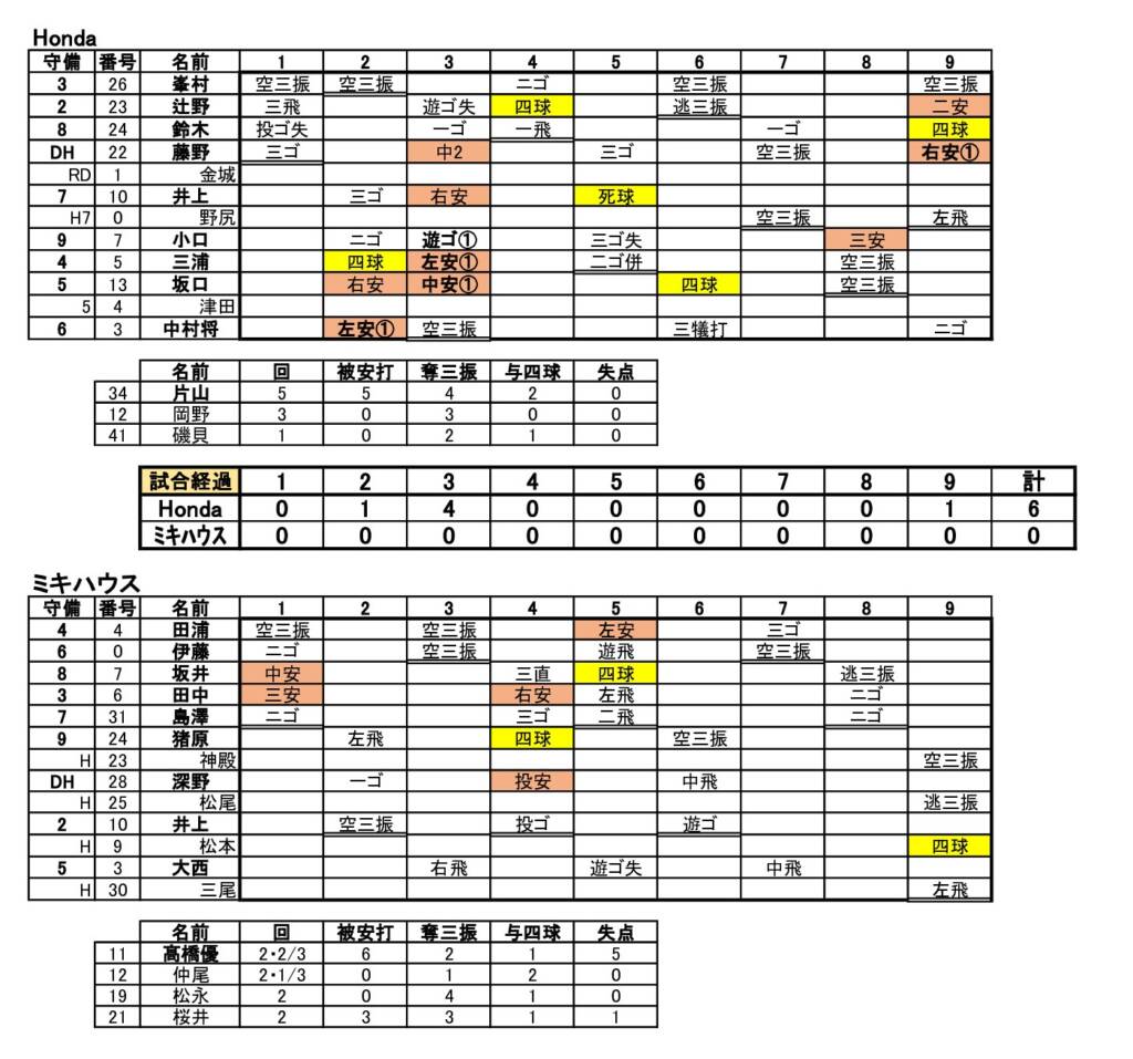 2年連続4回目の出場となったミキハウスに対し、Hondaは昨年の同大会準優勝チーム。先発はミキハウスが元巨人の髙橋優貴投手、Hondaは今年のNPBドラフトで横浜DeNAから4位指名を受けた片山皓心投手の左腕対決となった。