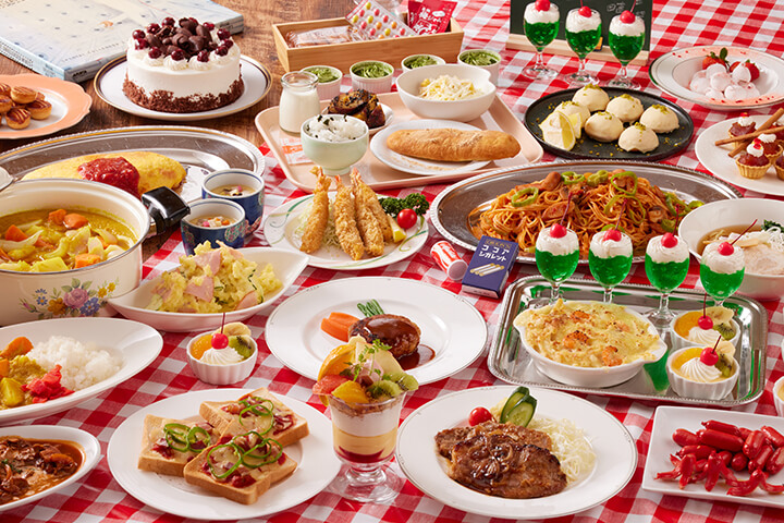 ハンバーグステーキやナポリタン、エビフライといった、当時の喫茶店や昔ながらの洋食メニューが並ぶ土・日曜祝日限定の「ランチブッフェ」。パフェやメロンソーダ風炭酸ゼリー、プリンアラモードといったスイーツも充実。ハンバーグステーキやオムライス、中華そばは、シェフが目の前で仕上げてくれます。