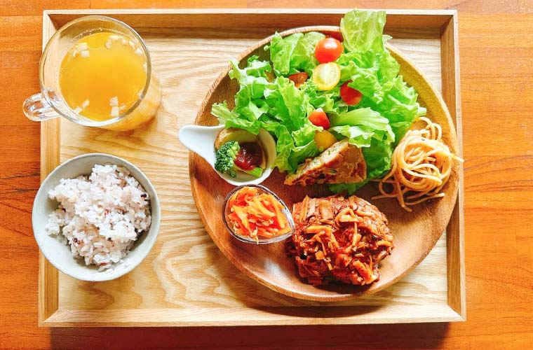 プレートの上にはメインのハンバーグのほか、自家農園の野菜を取り入れた野菜の小鉢が3~4種類とサラダが盛られています。取材日は「パプリカのしりしり」「オムレツ」「じゃことホウレンソウの炒めもの」「自家製ぬか漬け」がお目見え。どれも野菜の甘みが生きた優しい味わいです。