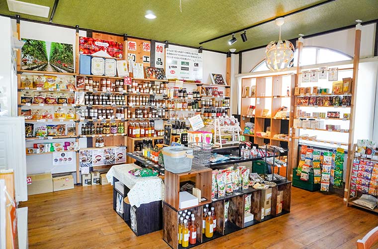 店内の販売コーナーには、社長が全国から選りすぐった無添加の食材や、「コープ自然派」の有機食材がずらりと並びます。「地域のみなさんに安心でおいしい農産物と交流を図る場所を提供したい」という社長の思いが伝わる品ぞろえ。カフェで提供する料理には、ここで販売している調味料を中心に使っているので、食材から調味料まで目に見え、安心していただけます。