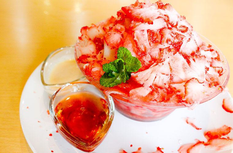 「かわいい!」の声が思わずもれるようなかき氷は、6月~8月末までの期間限定メニュー。自社農園で育てたイチゴをフレッシュな状態で凍らし薄くスライスしているので、どこを食べてもイチゴ味、むしろ“イチゴそのもの”とも言える究極のイチゴのかき氷です。なんと、大1個につき1パック分のイチゴを使っているというから驚き。添えられたシロップも無添加で、練乳も洗糖から手作りするなど、こだわりが尽きません。