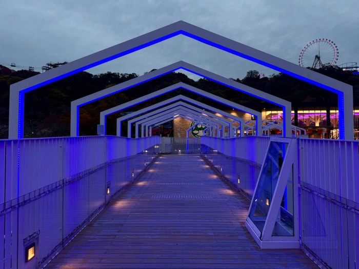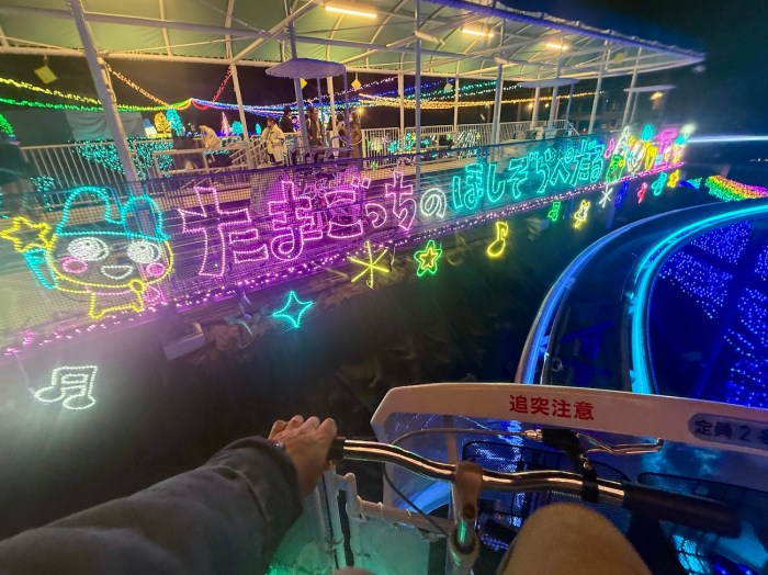 眼下にイルミネーションが広がる景色は圧巻で、まるで光の海の上を散歩しているような気分を味わえる。夜風を感じながら空中サイクリングを満喫できるのだが……見た目よりもはるかに高いから高所が苦手な方は気をつけるべし。