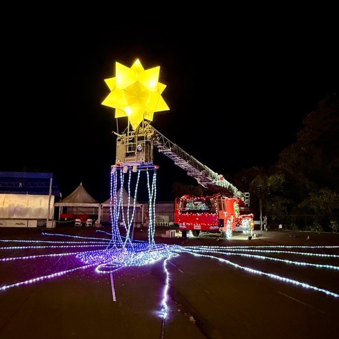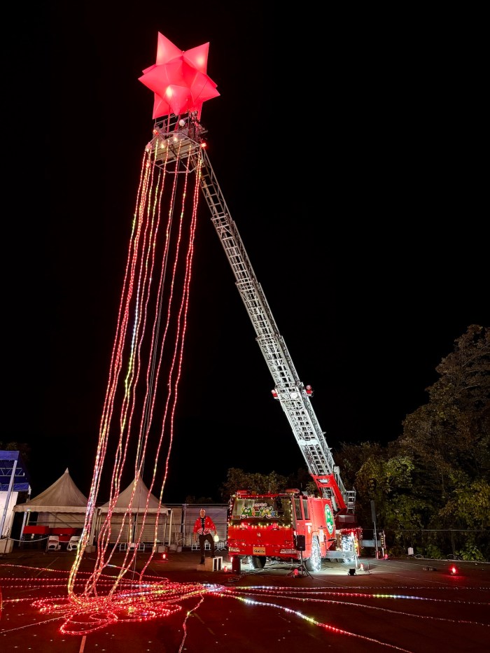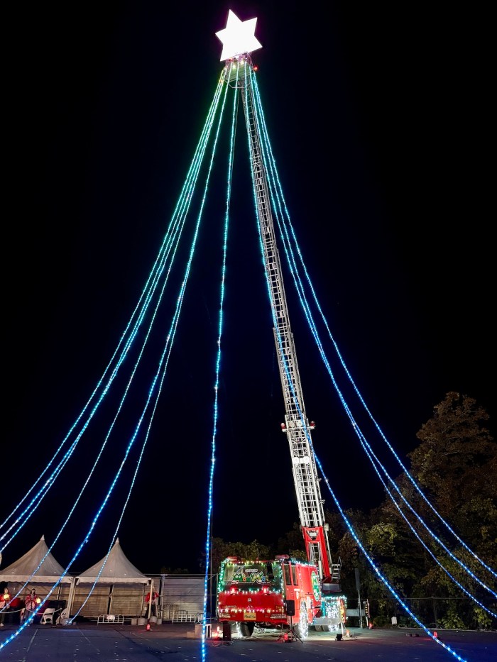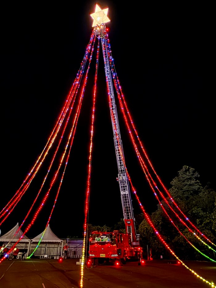 目の前に現れたのは、はしご車の巨大ツリー。消防車のはしごがゆっくりと伸びていき、先端に吊るされたLEDが上昇。高さ約30mの巨大ツリーが徐々に完成していく。たまごっちからの回転スライダー、そして巨大ツリー……夢以上に急展開である。