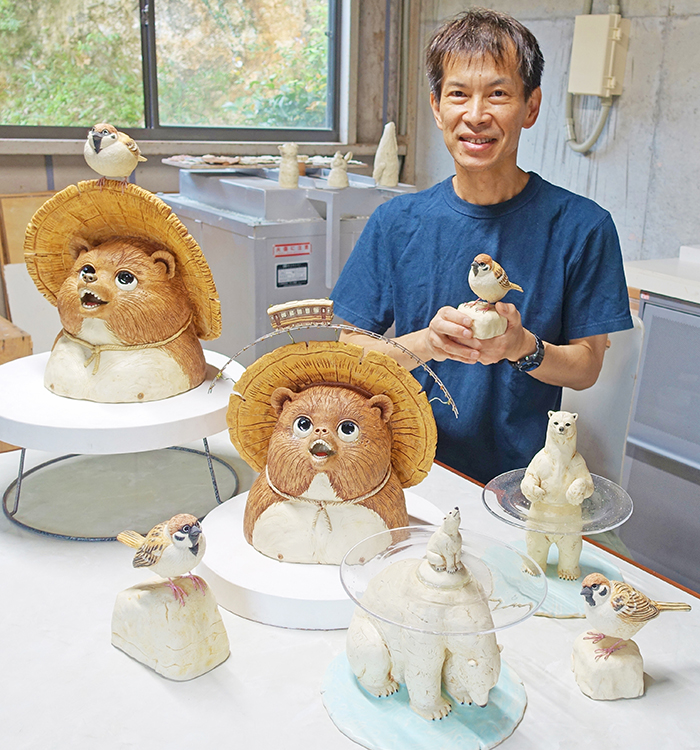 同ギャラリーでの個展は3回目で、「柔らかい粘土の動物が、焼成によって固く冷たい陶器になってしまう。そんな制限のある中だが、動物の温かみを感じ取ってもらえれば」と話した。