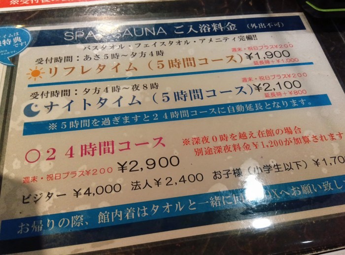 ちなみに、一般の24時間コースは税込2900円だけど、深夜0時を越えて在館の場合、別途深夜料金が1200円加算されて4100円になる。この24時間コースの料金は会員の種別ごとに違うようだ。