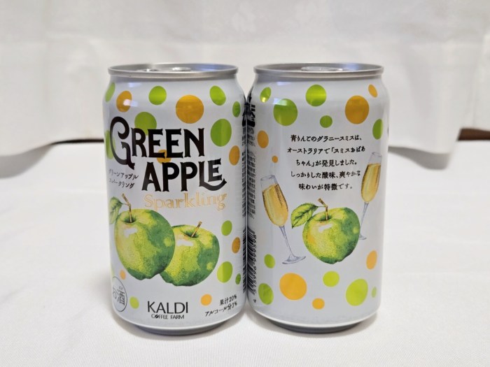 毎年入っていたボトルのシードルは、「グリーンアップルスパークリング」という350ml缶2本へと変更に。