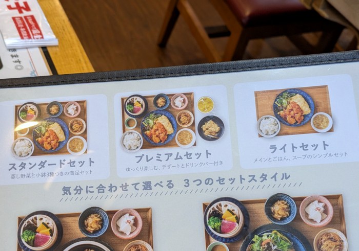まず目をひいたのが、最初のページに載っていたランチ。ここのランチは、もっともシンプルな「ライト」。主菜に副菜・スープまでついた「スタンダード」。さらにデザートとドリンクバーまでついた「プレミアム」の3タイプ用意されている。