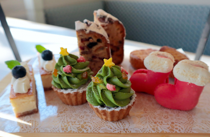 続いて下段にはサンタのブーツに見立てたマカロンや、ツリーのような見た目の抹茶タルトが。特にタルトはサクサク生地と濃厚な抹茶のクリーム、中にはしっとりとした栗の甘露煮が入っており、一気に和の雰囲気に♡