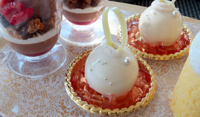 オーナメントに見立てた洋梨のムースは、見た目・味ともに記者一番のお気に入りに。シャンパンのジュレと洋梨のコンポートが隠れているのですが、まるで凍っているかのような洋梨のシャリシャリ感がたまらなくおいしいんです!