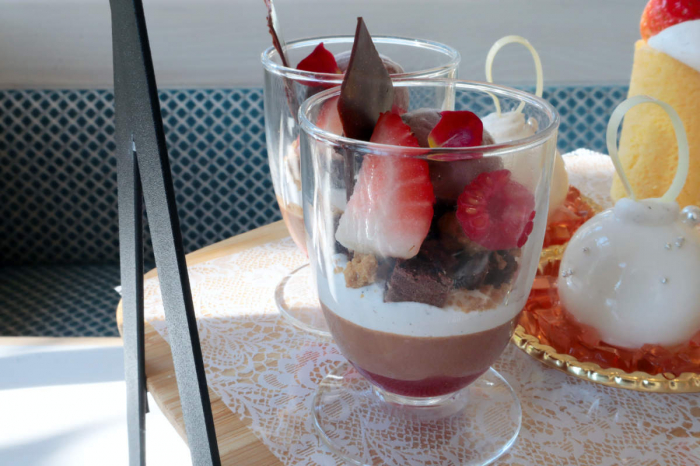 さらにこちらのパフェは、旧ムーア邸で販売されているパフェの”いいとこどり”になっているそう。かわいいサイズですがチョコアイスやケーキが贅沢に盛られ、なめらかなムース2種との相性抜群です。