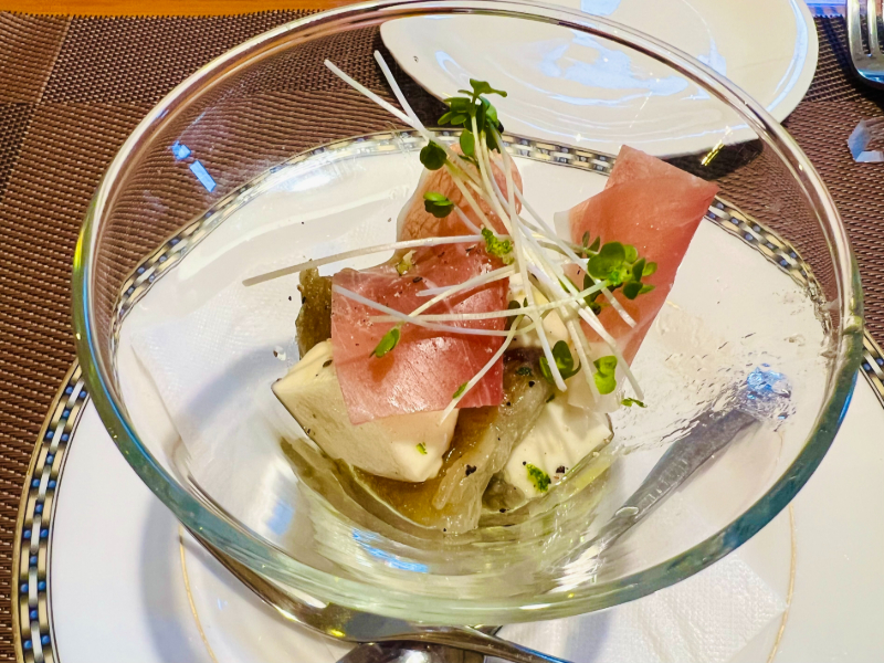 一番最初に出てきたブーシェ「白ナスのマリネと生ハム」を味わった瞬間から、感嘆の声が漏れました。