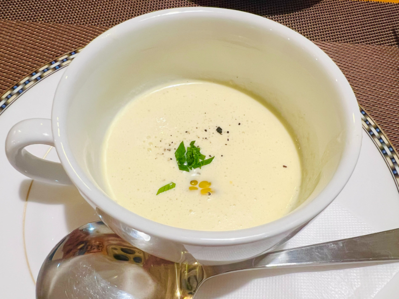 この日は「冷製とうもろこしのポタージュ」。季節に合わせて、日によってその時々に美味しい素材でテーブルが彩られます。