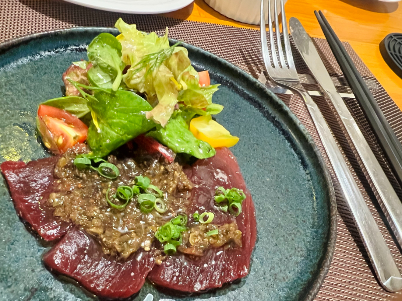 こちらは「南マグロのカルパッチョ、小さなサラダ」。このサラダのドレッシングも目を見張る美味しさ。