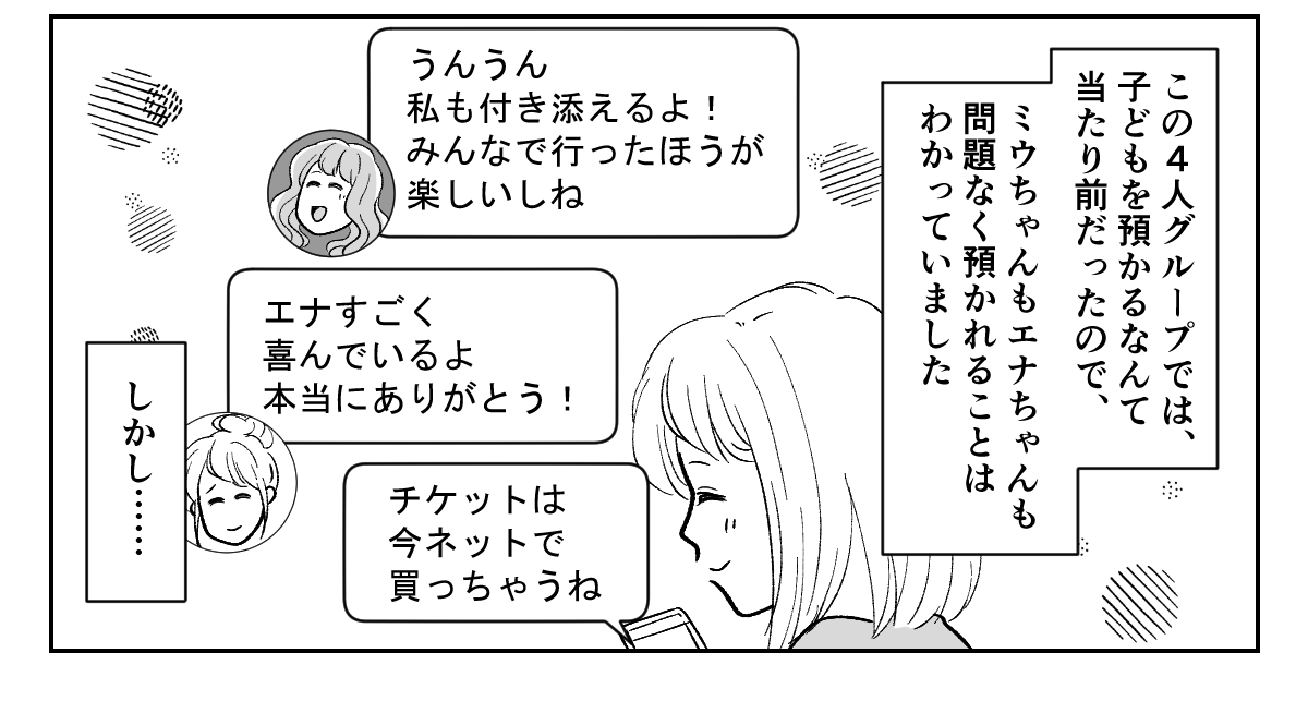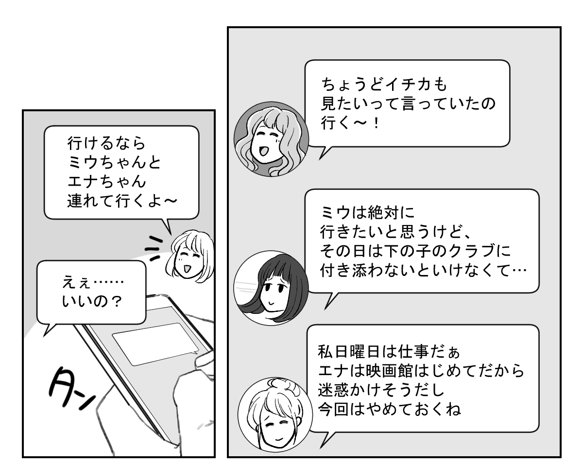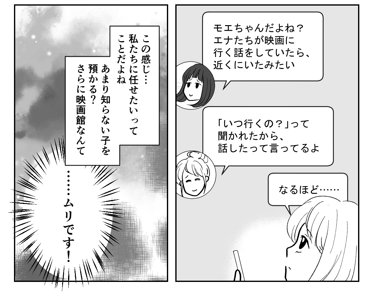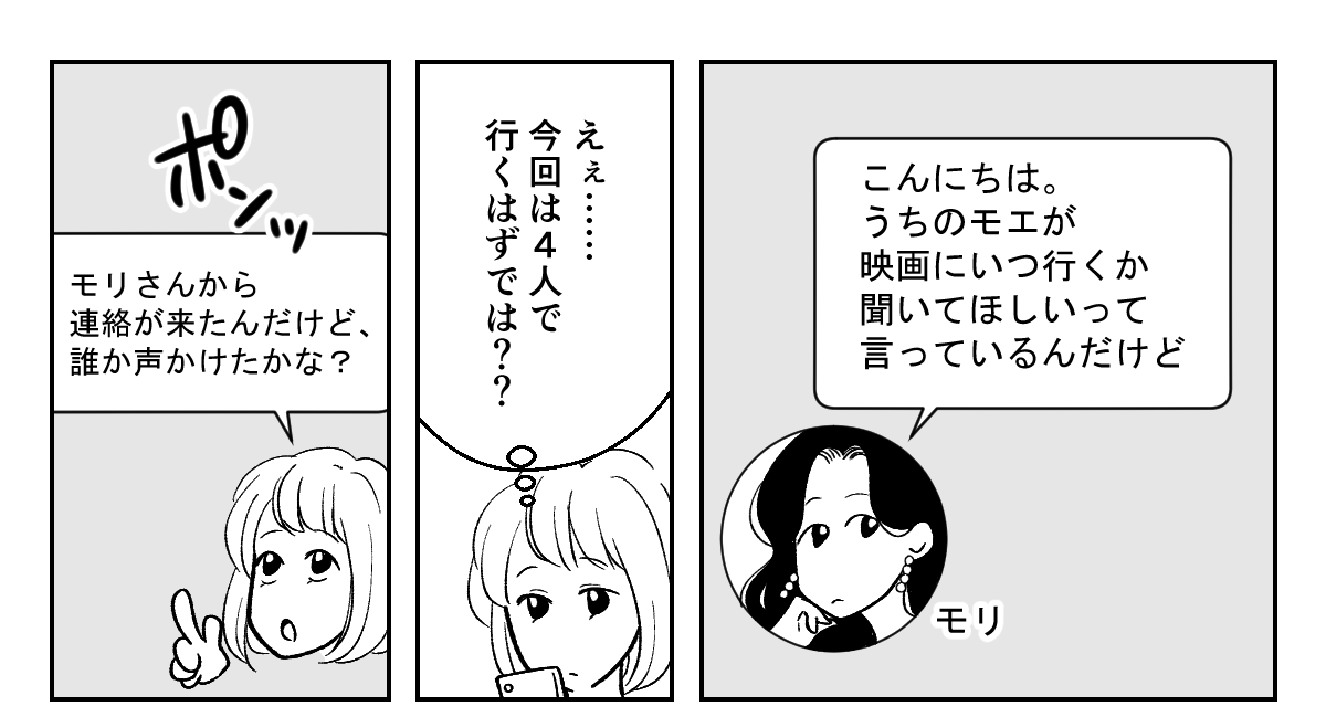 その後、普段あまり関わりのないモリさんから「映画にいつ行くか聞いてほしいと子どもが言っている」と連絡が来ました。今回はいつもの4人で行くものと思っていたのですが……。