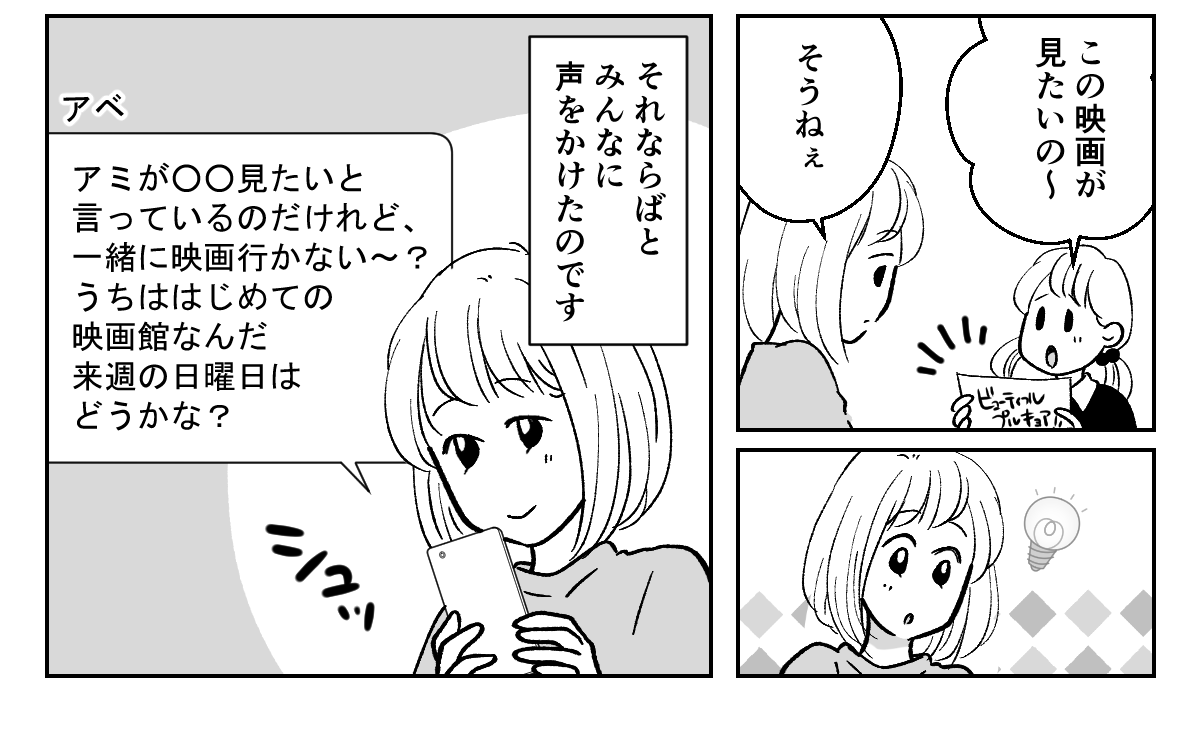 アミが「○○の映画が見たい!」と言うので、お友だちと一緒に行ければもっと楽しめそうと思い、いつものメンバーに声をかけてみることにしました。アミは映画館で映画を見るのは、はじめてです。「来週の日曜日はどうかな?」と聞いてみました。