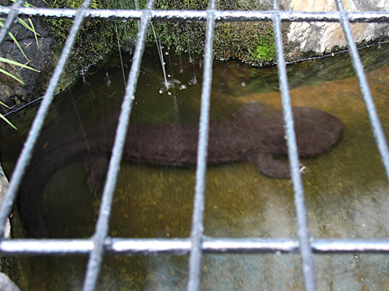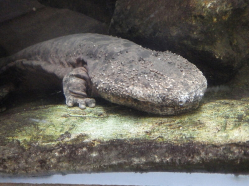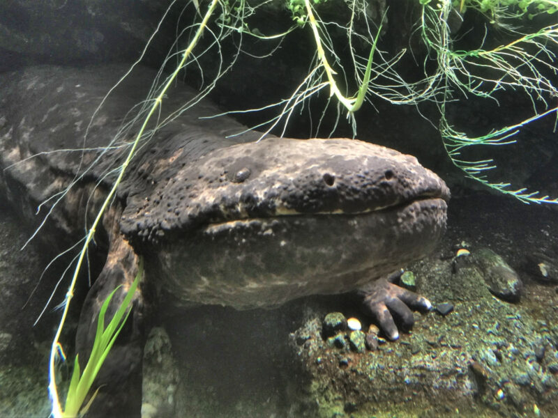 オオサンショウウオは省エネタイプの生きもので、あまり動きません。呼吸は1時間に数回ほどで、1週間に1匹の魚を食べれば生きていけるそう。