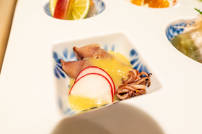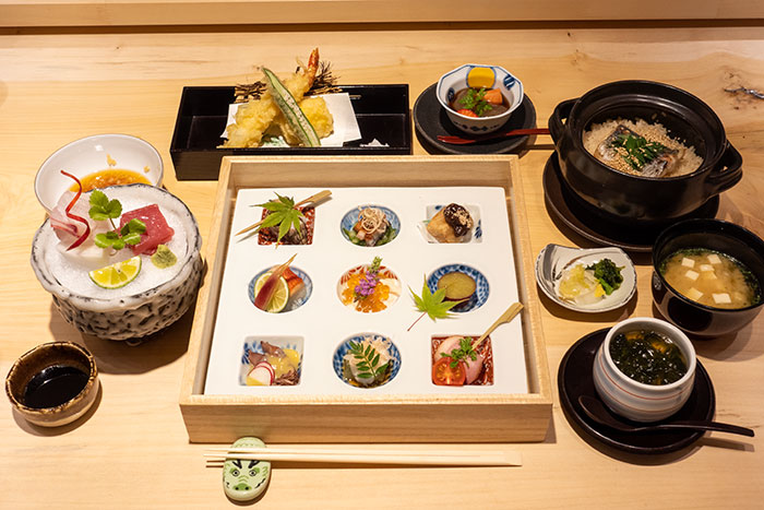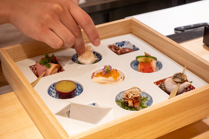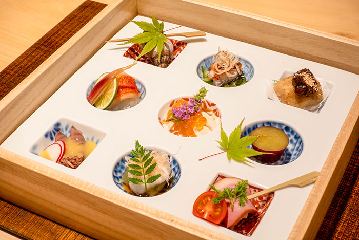 旬の食材を使用した「前菜盛り」は、季節によって変わる全9種類の前菜が有田焼の特注の器に、まるで宝石のように美しく盛られています。