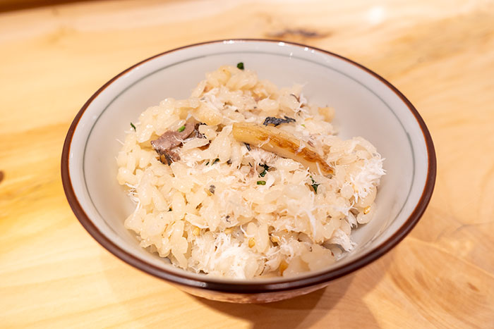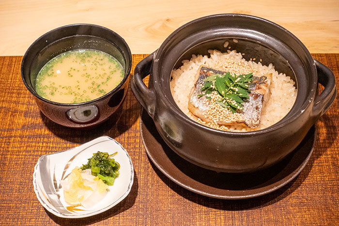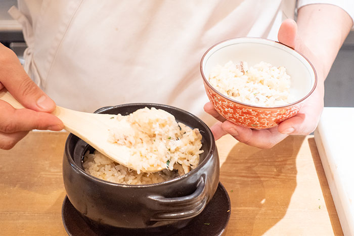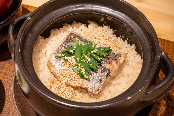 ご飯はお店の方が混ぜ合わせてくれます。香ばしく噛むほどに旨みのある焼きアジに香りの良い木の芽がアクセントとなり、旬の美味しさが味わえる逸品です。
