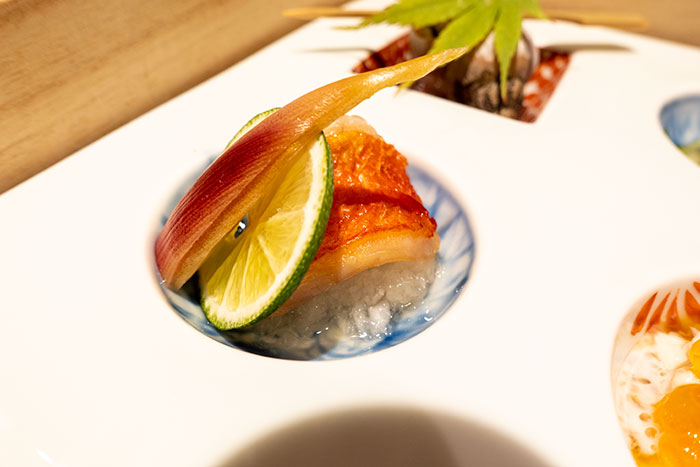 こちらは「金目鯛の焼き物」。脂の乗った金目鯛を大根おろしと共にさっぱりと味わえる逸品。