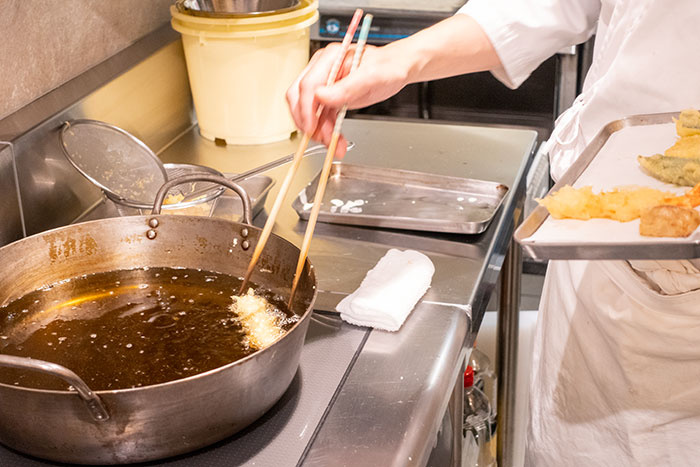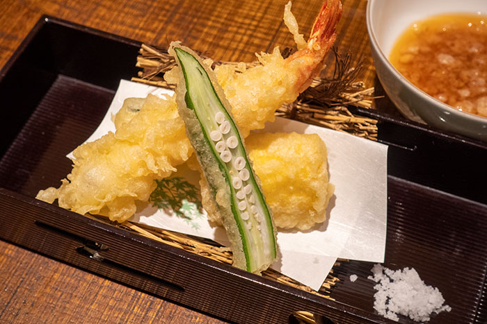 続いては「揚げ物」!この日は、エビ、オクラ、とうもろこし、ズッキーニの4種の天ぷらでした。上品な口当たりの天ぷらは、塩または天つゆで召し上がれ。