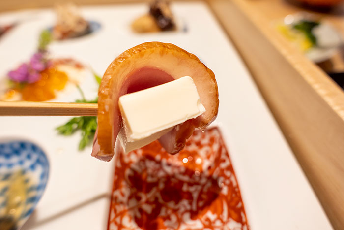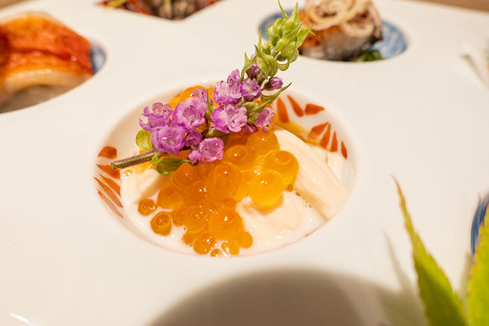 こちらは「生湯葉」。クリーミーな生の湯葉をいくらと共に味わえる至福の逸品です。