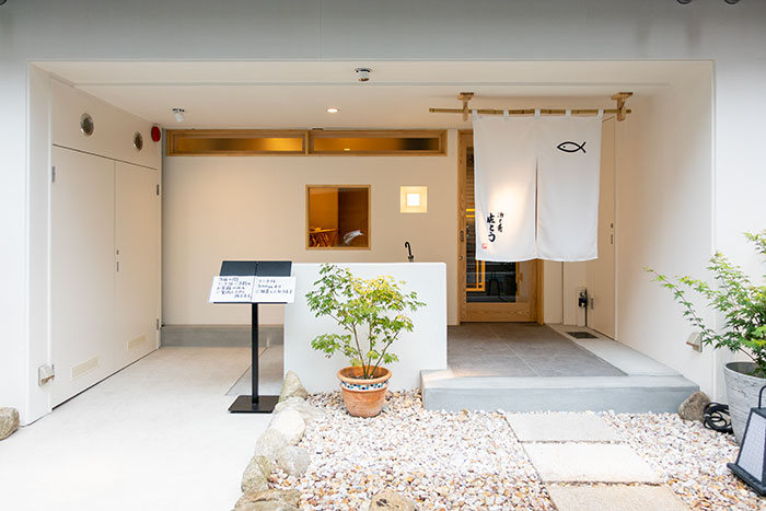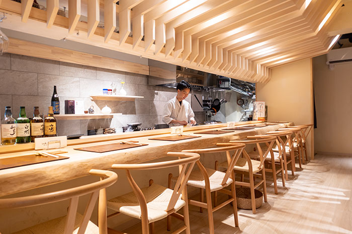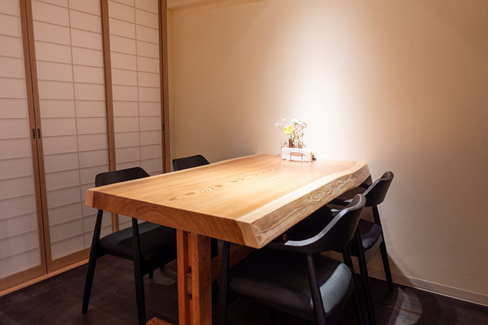 店内は、カウンターが8席、半個室のテーブルが2卓の全16席。木目を基調とした洗練された空間で、広めのカウンター席とプライベート空間で楽しめる半個室が魅力です。