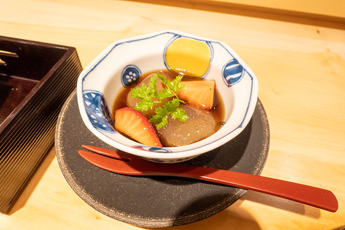 最後は「デザート」!この日は『黒蜜わらび餅』でした。じっくり煮詰めた黒蜜をわらび餅と苺にかけていただく、上品な和スイーツです。