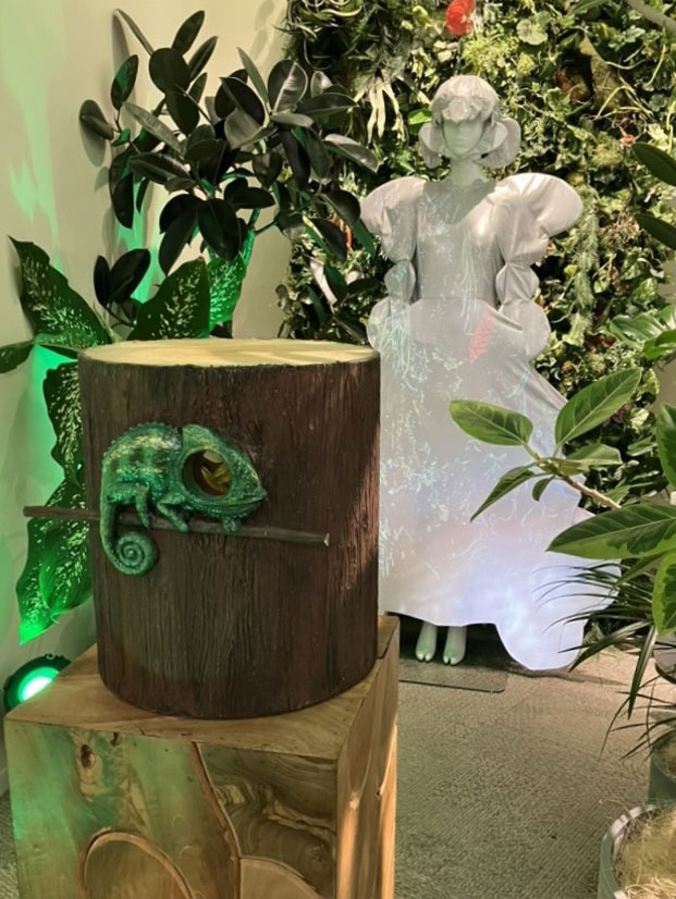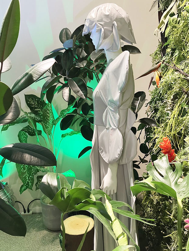 注目は、大阪・関西万博の大阪ヘルスケアパビリオンで話題を集めた「透明に見える服」 の特別展示。再帰性反射生地 × 植物映像の組み合わせによって、ドレスが自然の中で“消えていく”ように見える驚きの作品は、12月14日(日)まで観ることができます。「サステナブルをテーマに未来のファッションを描いた、マツオインターナショナルの企画展示のひとつです。展示期間中は、店内でアートとしてのファッションをゆっくり体感いただけます。」と「ロン・都」の担当。