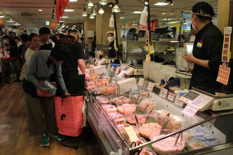 惣菜類も海鮮など盛りだくさんで、干物やサーモンルイベ漬、日高昆布ちりめん、本数の子黄金松前など、北海道ならではの味覚が並んでいる。