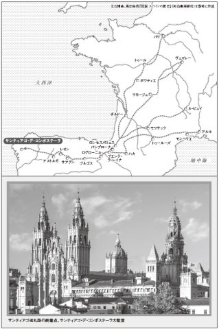 さて北では、ピレネー山脈を伝ってヨーロッパ大陸と陸路で繫がっています。確かに急峻なピレネー山脈は交流の障害になりました。しかし中世には峠を通ってサンティアゴ巡礼路が整備され、ヒト・モノ・情報が激しく行き交っていました。現在のカタルーニャ地方では、山脈と呼べるほどの交通上の障害はなく、南仏と簡単に行き来することができました。海路において、イベリア半島北の大西洋沿岸部の港は、フランスやイギリス、そして中世西欧世界で最も都市化し経済的にも文化的にも栄えたフランドル地方(フランス北東部からベルギー、オランダ南西部にかけての地方)と交流を繰り返しています。これらの交流の結果、イベリア半島北部に勃興したキリスト教諸国もまた、この西欧世界のなかの一員としてのアイデンティティを当然ながら抱くようになっていきました。