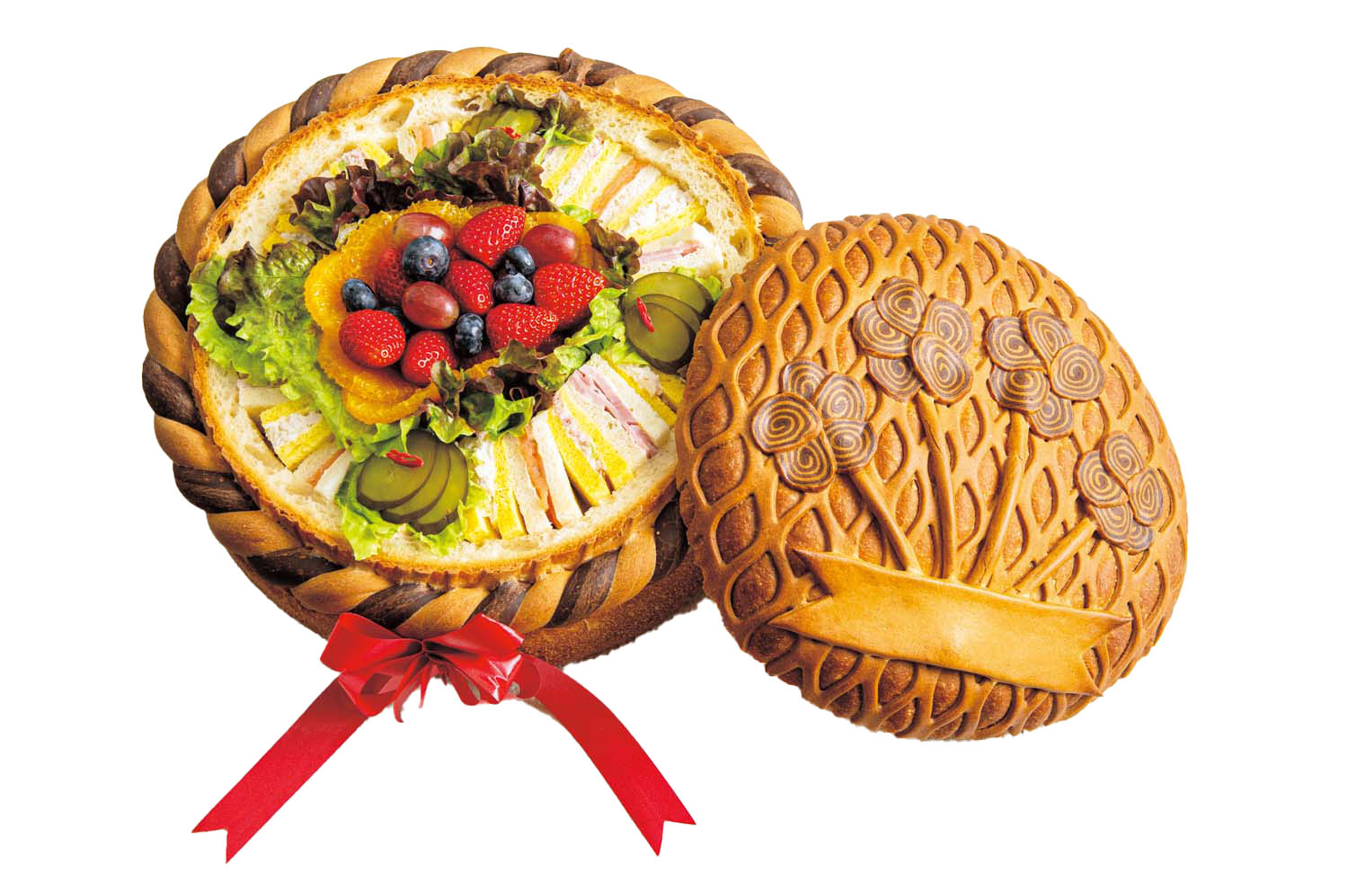 帝国ホテルで長く愛されてきたサンドイッチをテイクアウトで楽しめる。ベーカリーシェフが特別に焼き上げた直径30㎝のパン製のバスケットで、ふたを開けると、フルーツと4種の具材を挟んだサンドイッチが48個、上下2段にぎっしりと詰められている。誕生日やお花見などのパーティーにも喜ばれること必至! 具材はハム、スモークサーモン、チキンサラダ、カニサラダ。7日前まで要予約。