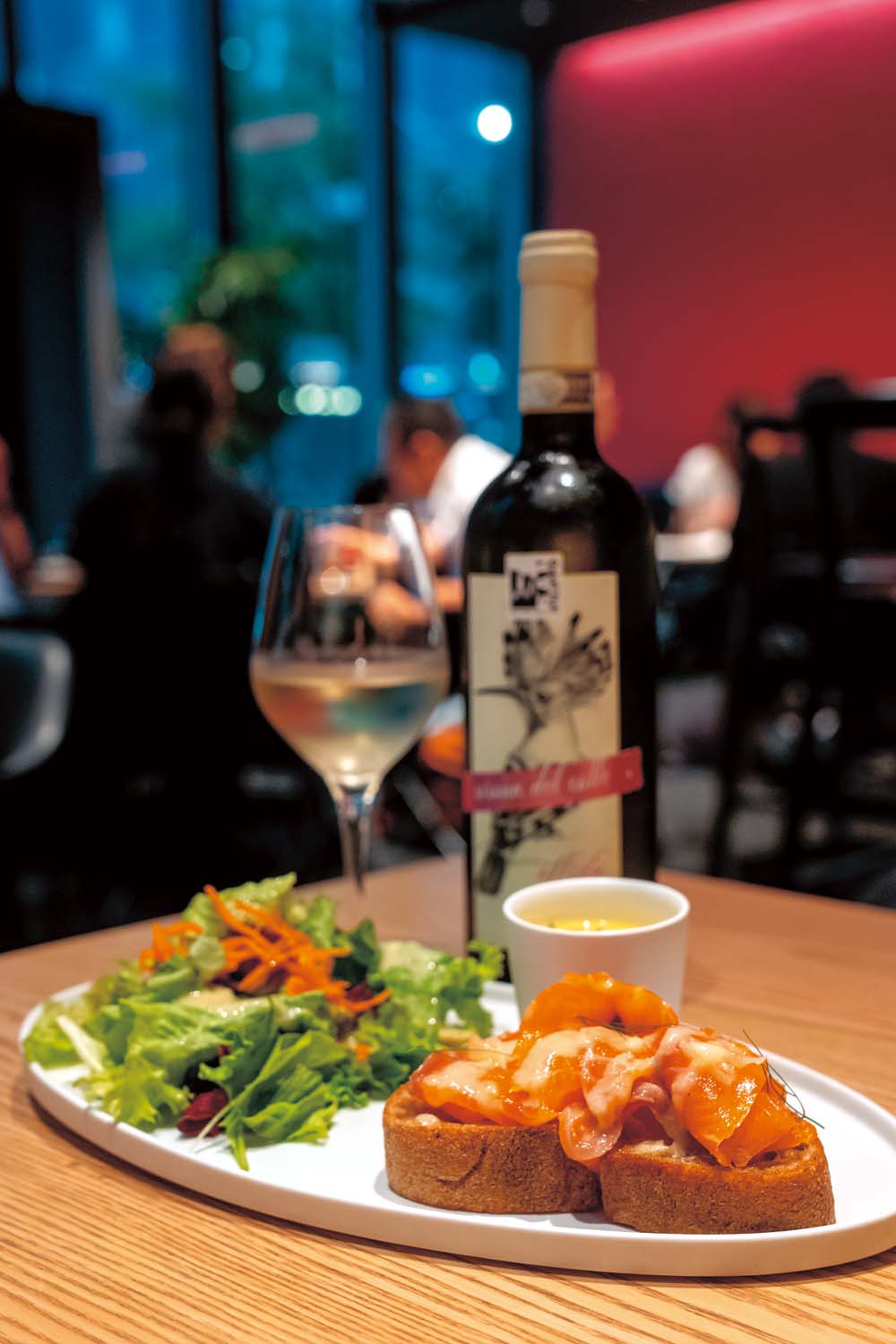 東京駅改札内、新幹線北乗換口前にあるイタリアンバール。名物はバターが香るサクサクのエクレア生地に作りたてのイタリア料理を挟んだ東京パニーノだ。サラダ感覚の冷製パニーノや熱々パスタのカルボナーラ、メインディッシュ的なビステッカなど6種類から選べる。3口ほどで食べられる小ぶりなサイズ感で、ワインのおつまみにもぴったり。持ち帰りもできる。ワインは購入もOK。