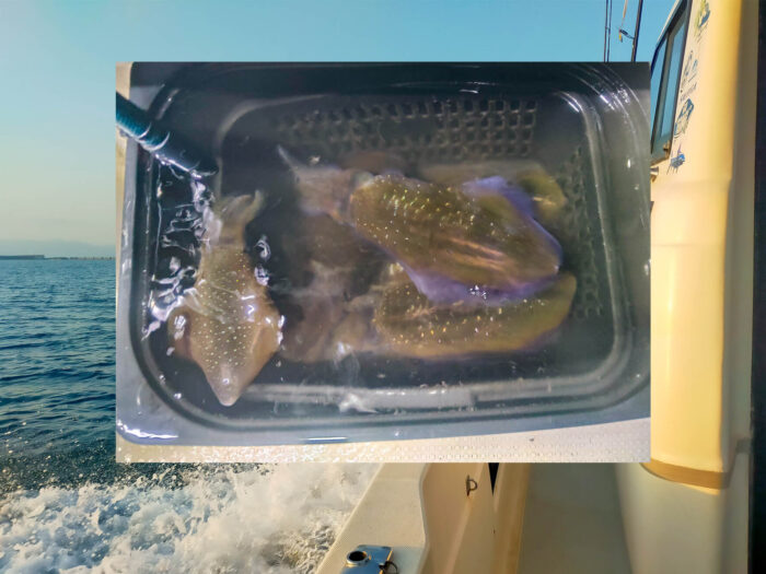 ティップランはアタリが小さいので、わずかに動くティップを見て掛けなければいけない釣りです。その動きが小さくて初めはよく分からない…。しかも揺れる船の上なのでロッドを動かさないように身体で揺れを吸収しなければなりません。シャクったあと、エギを水中で動かさないようにしないとイカがエギを抱かないのです。